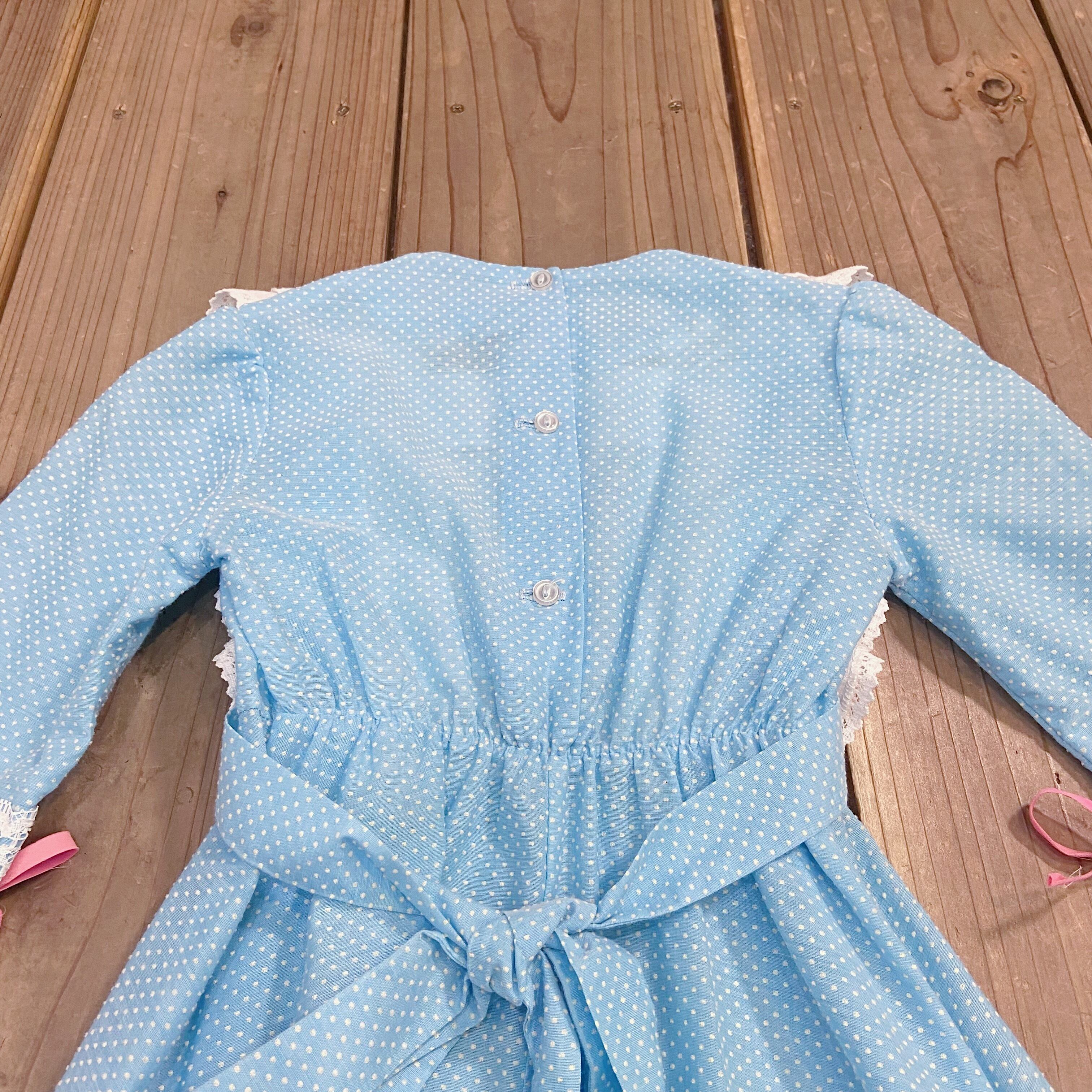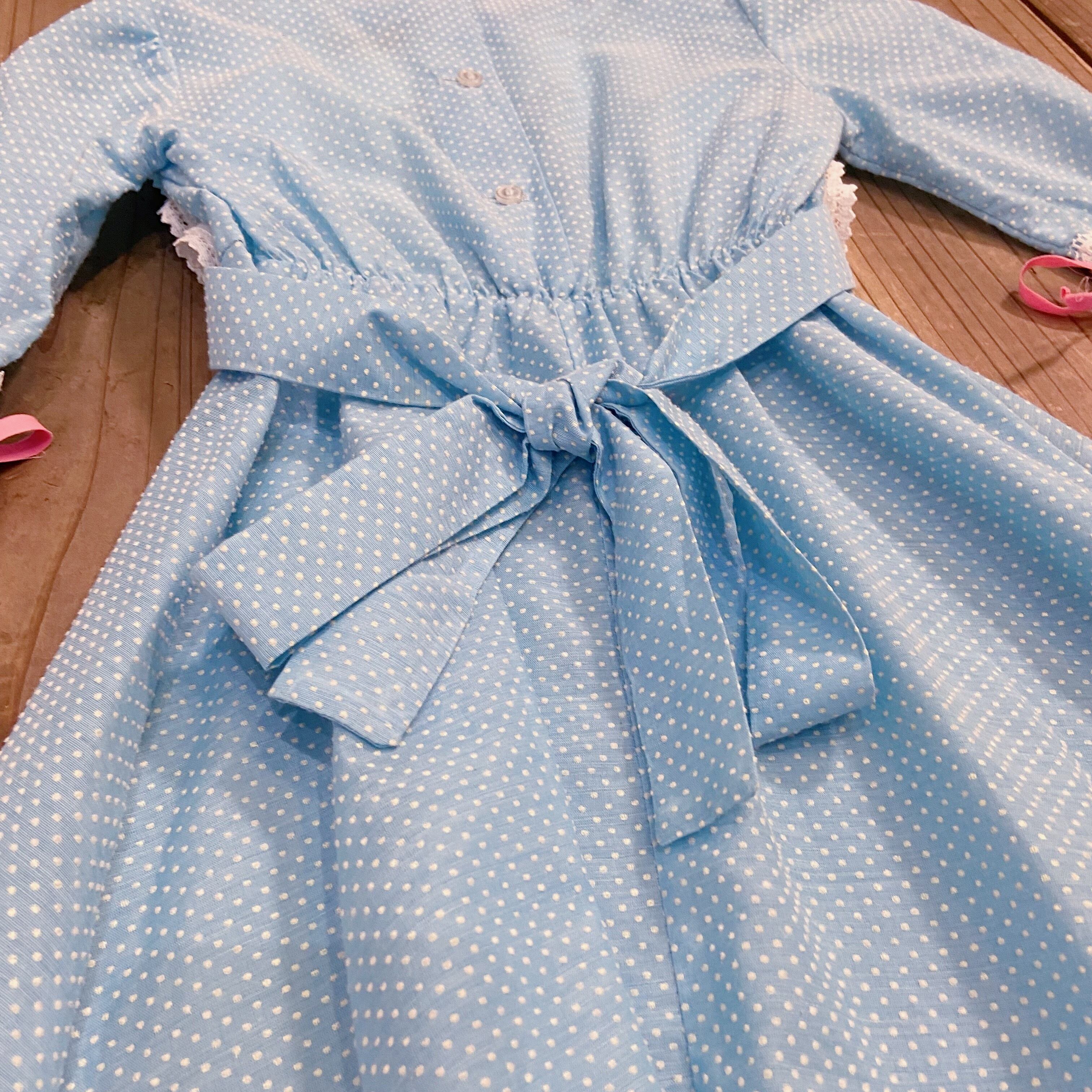 【size110-120】60s Blue flower embroidery race ribbon dots dress