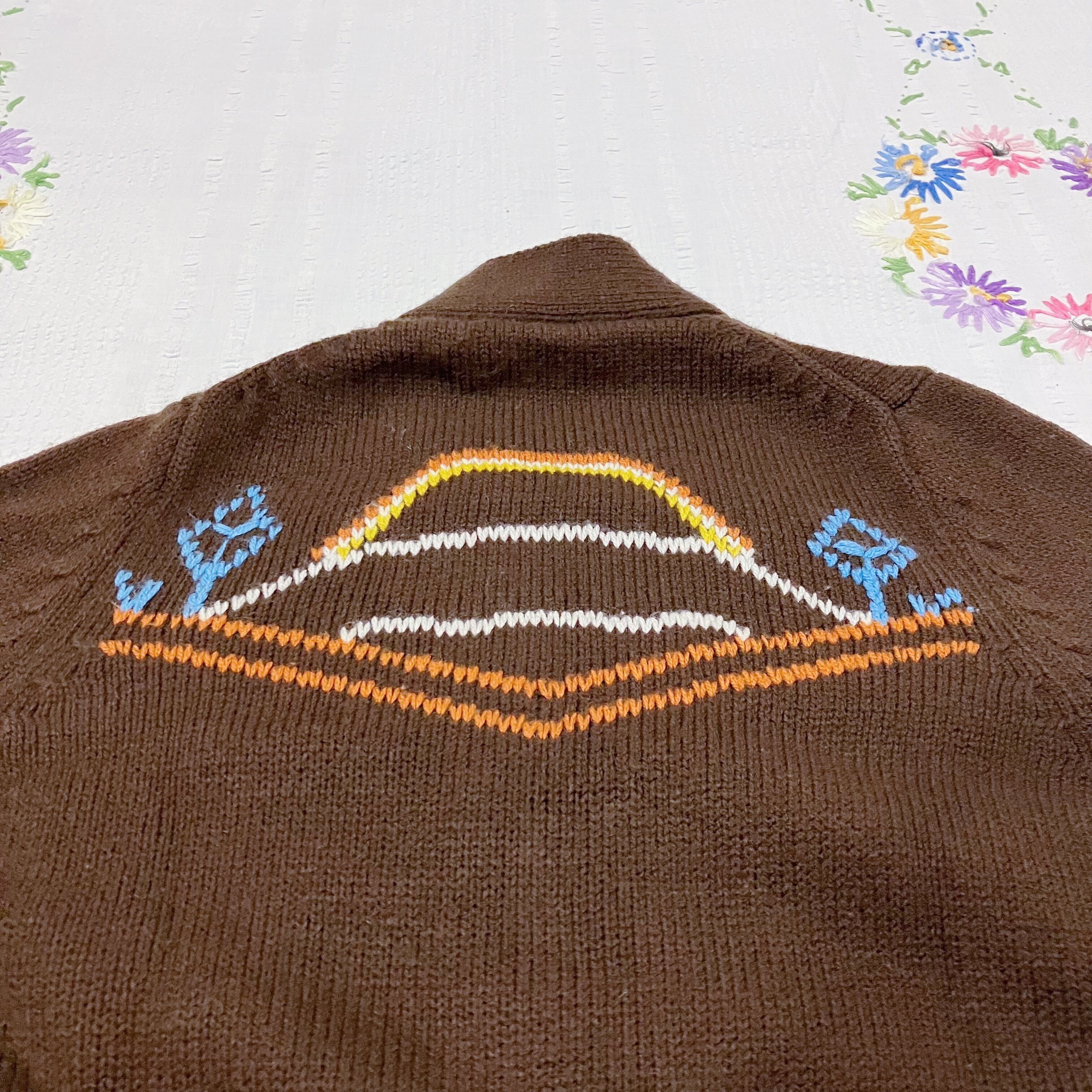 おうちのモチーフがゆるく編まれた、70年代のニットカーディガンです。