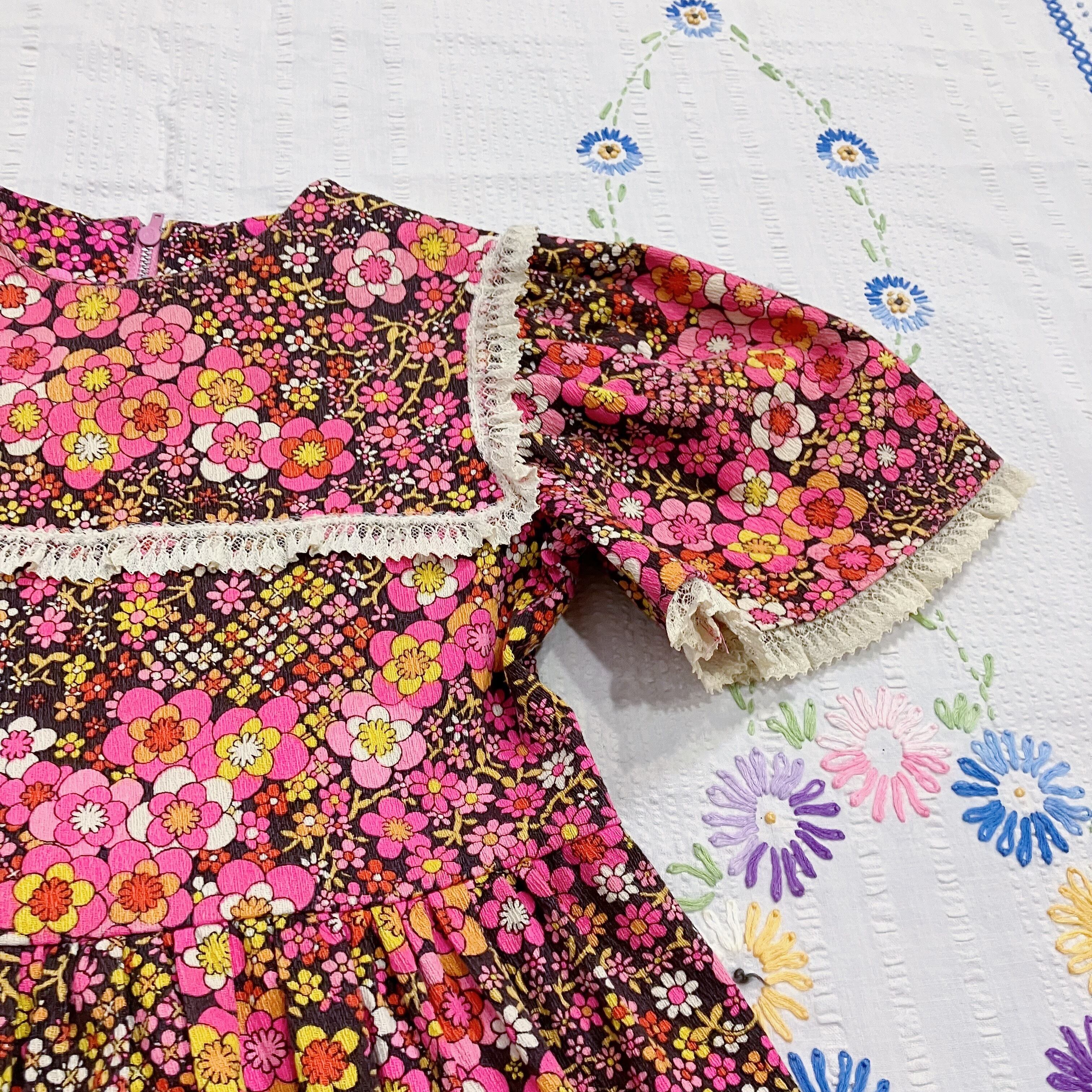 ピンクと黒の花柄が可愛い60〜70年代のワンピースです。