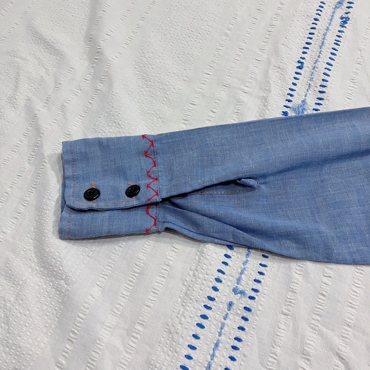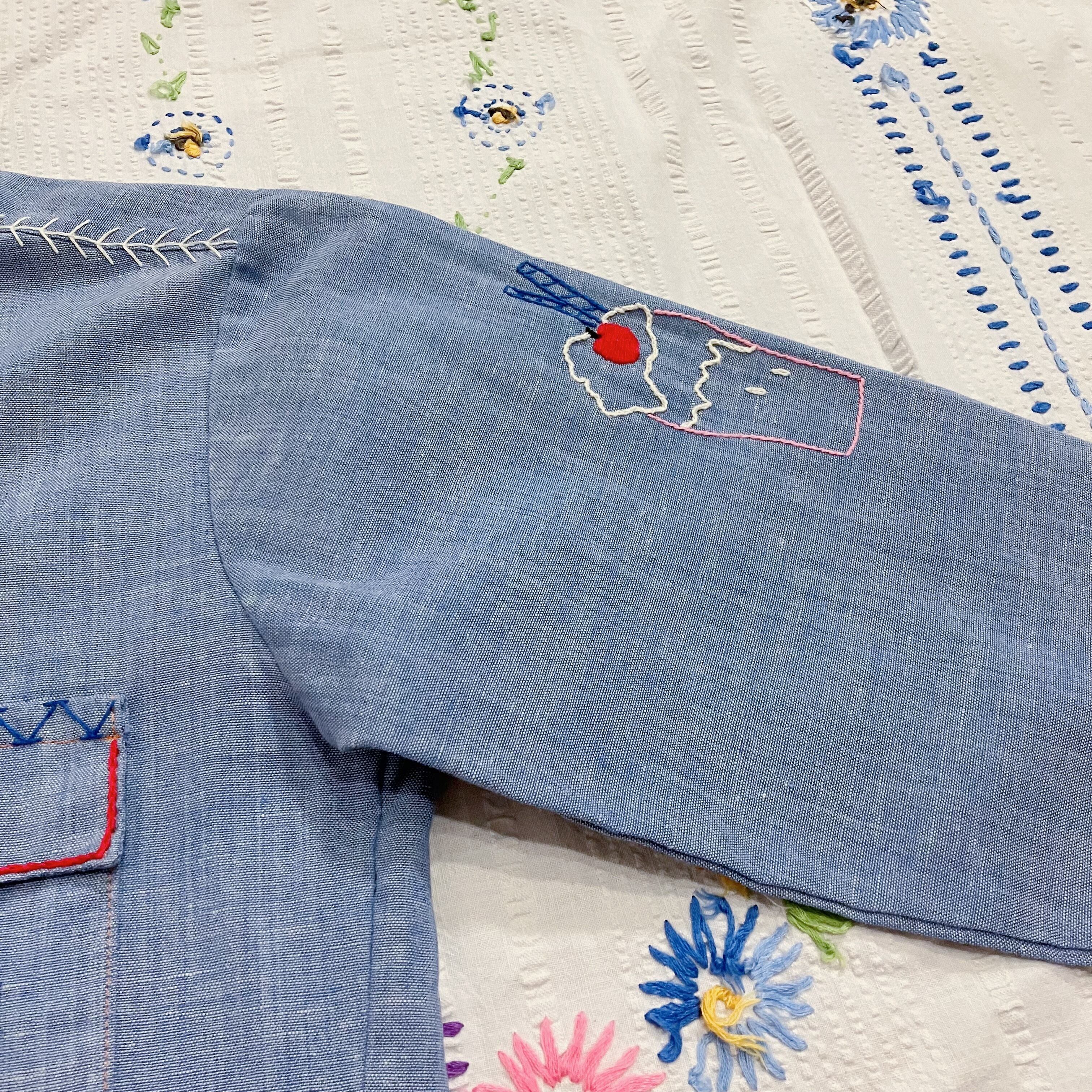 シェイクや風船、ひよこ、、とにかくポップで可愛い手刺繍がユニークなシャンブレーシャツ。