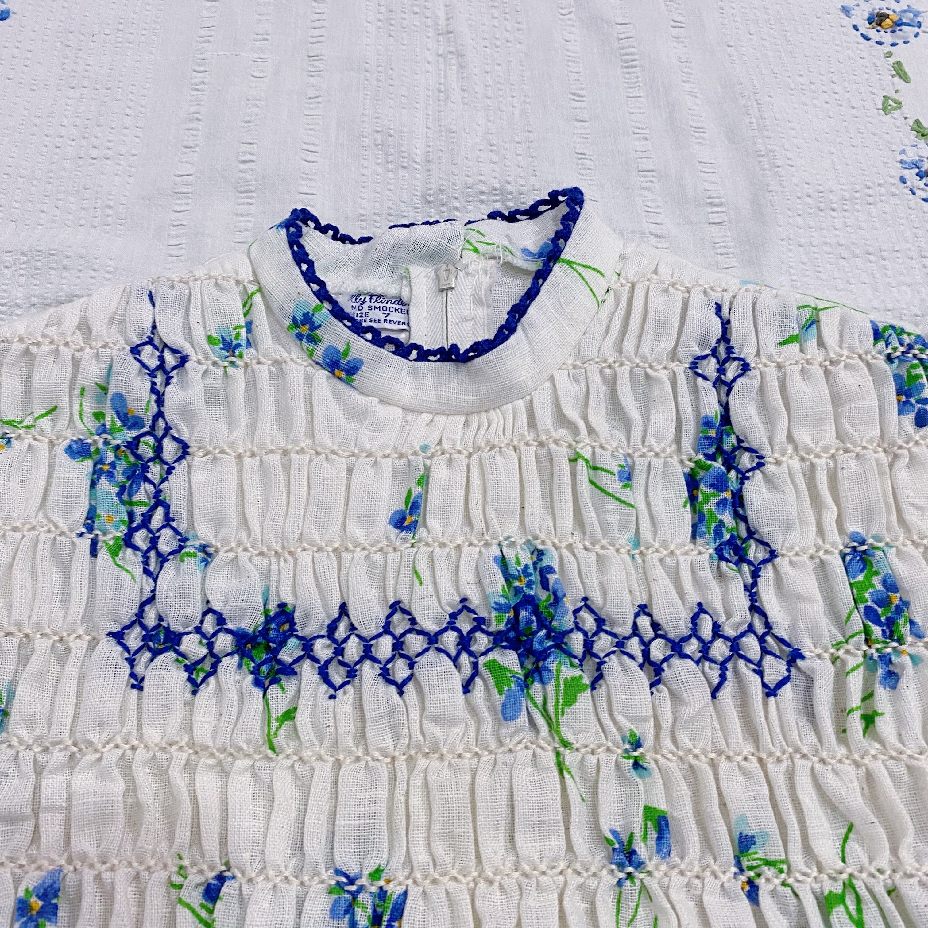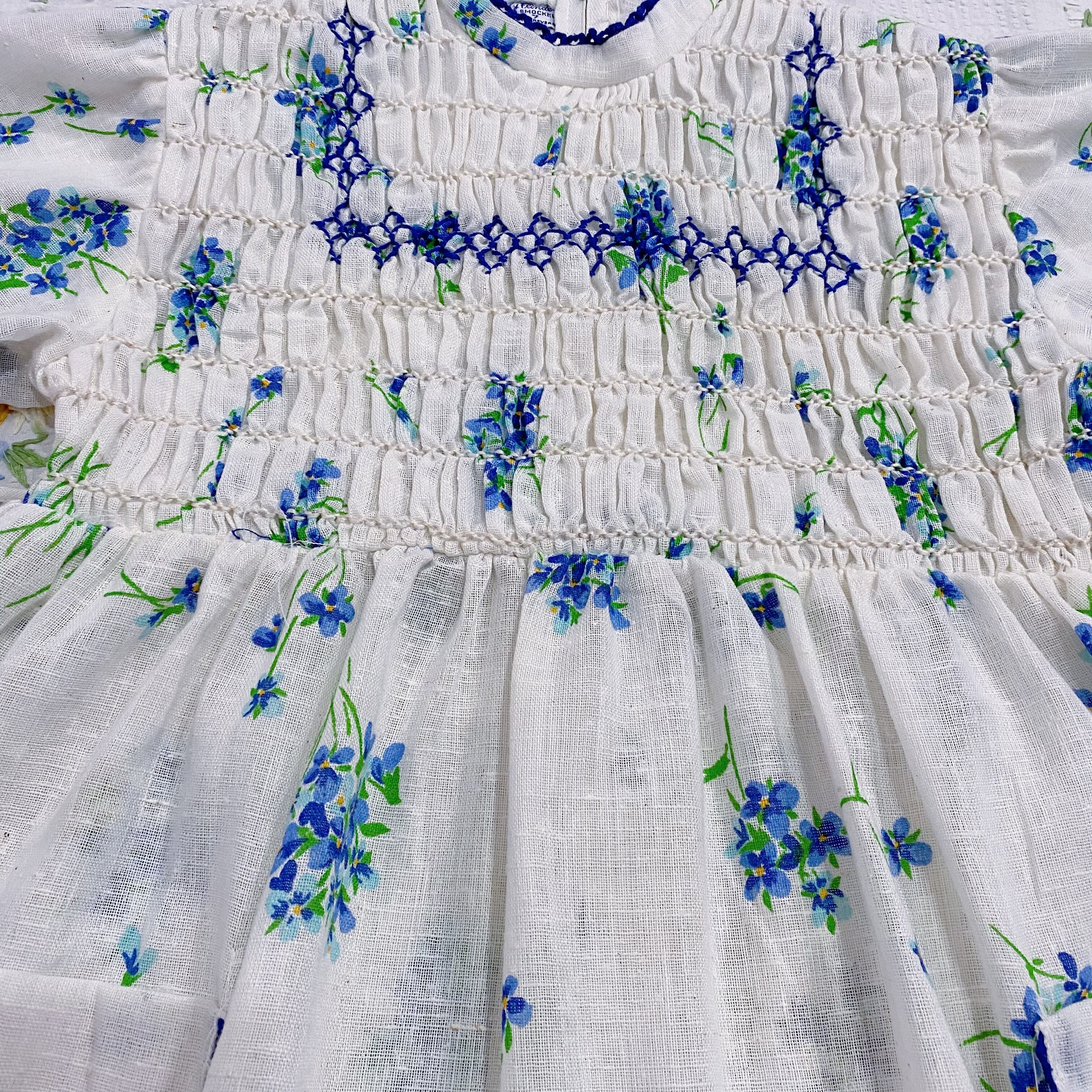 小花柄に胸のスモッキングが可愛いワンピース。