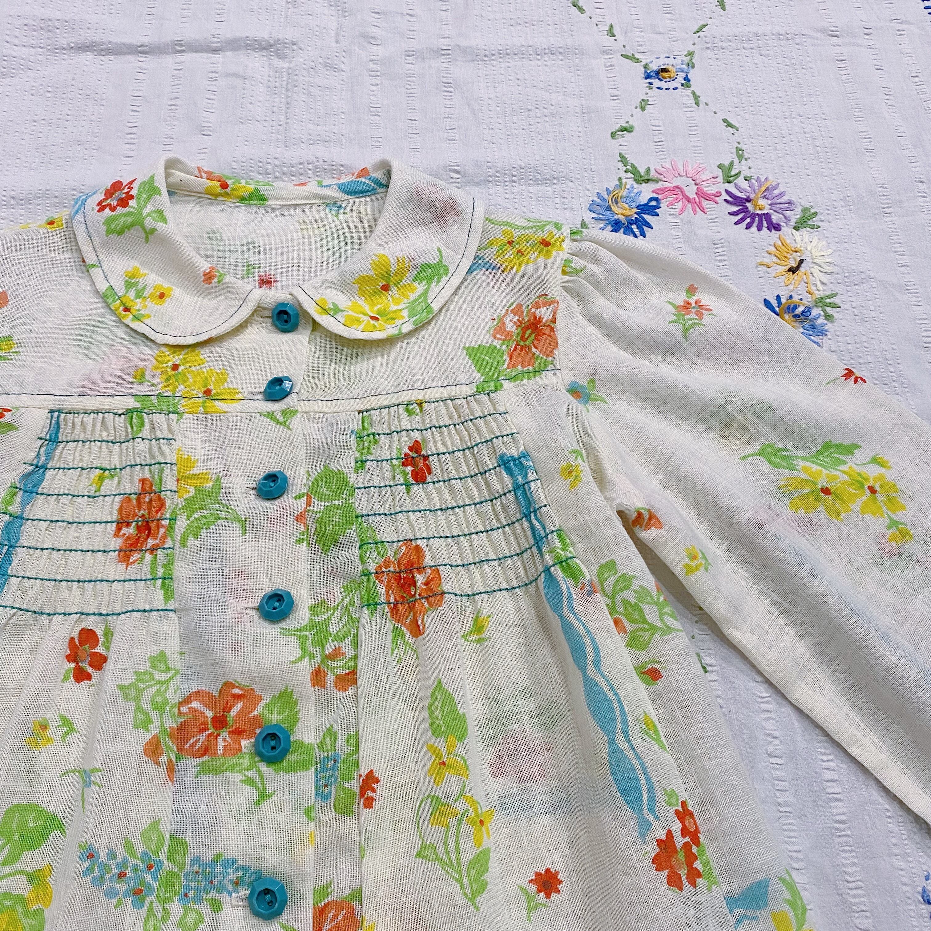 丸襟に胸のスモッキング、ポップな花柄が可愛い!