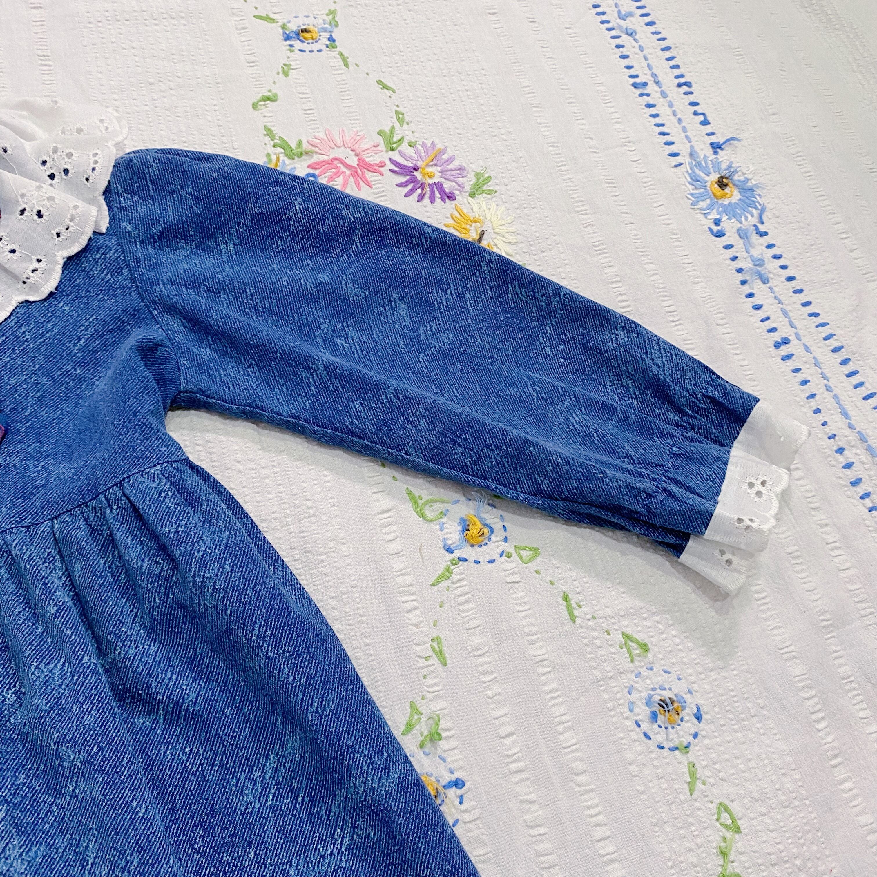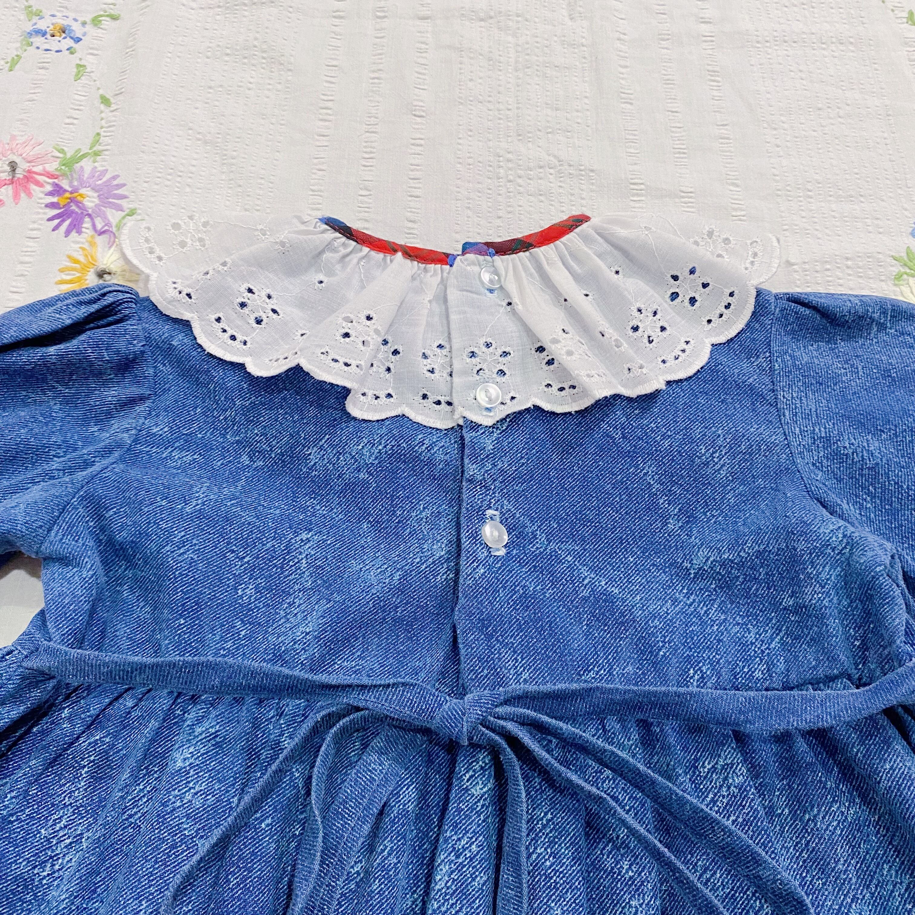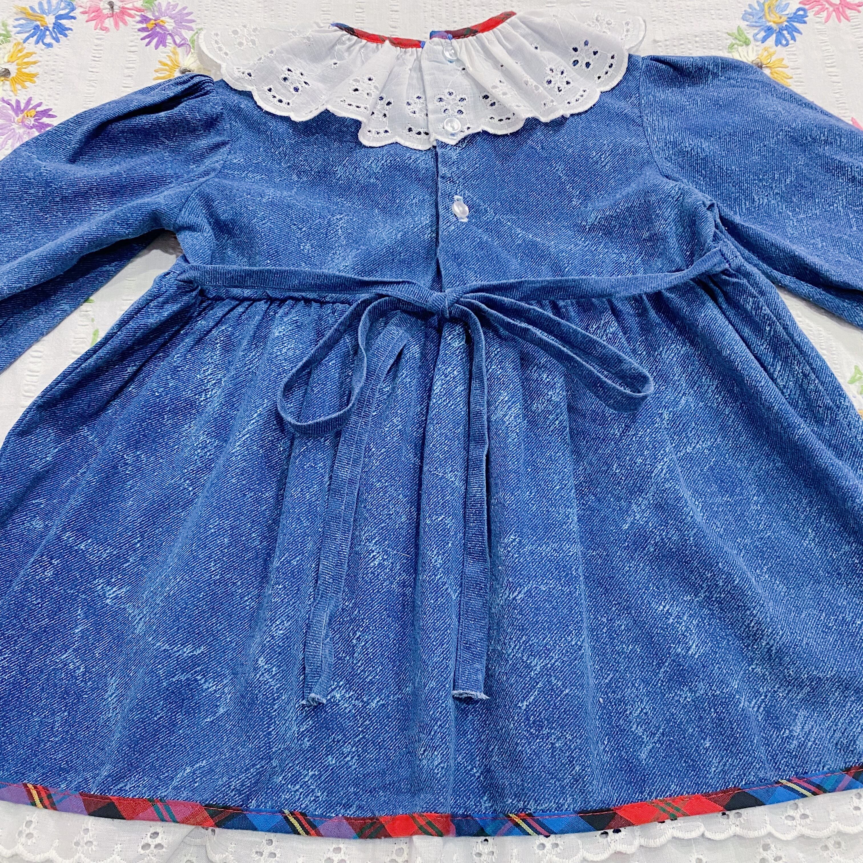 デニムプリントに、チェック柄のリボンやフリフリがかわいいワンピース。