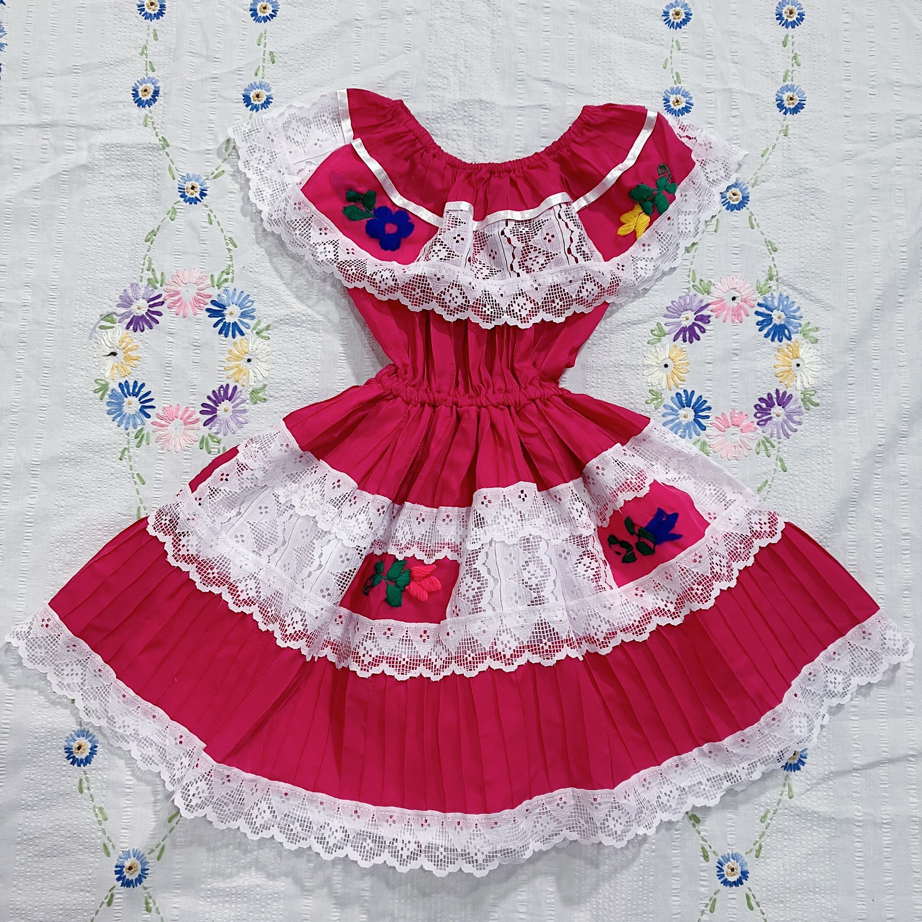 お花の刺繍と、たっぷりのレースがかわいいメキシカンワンピース!