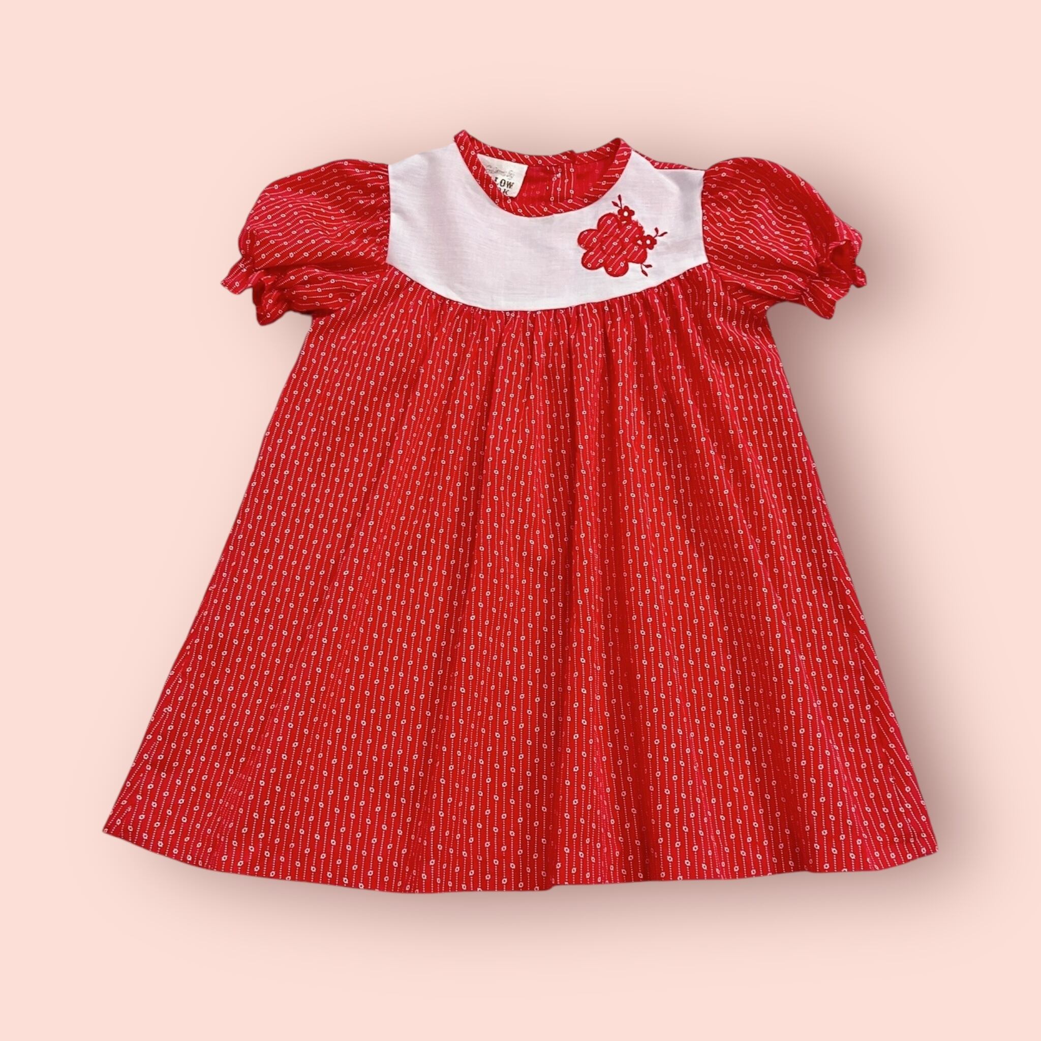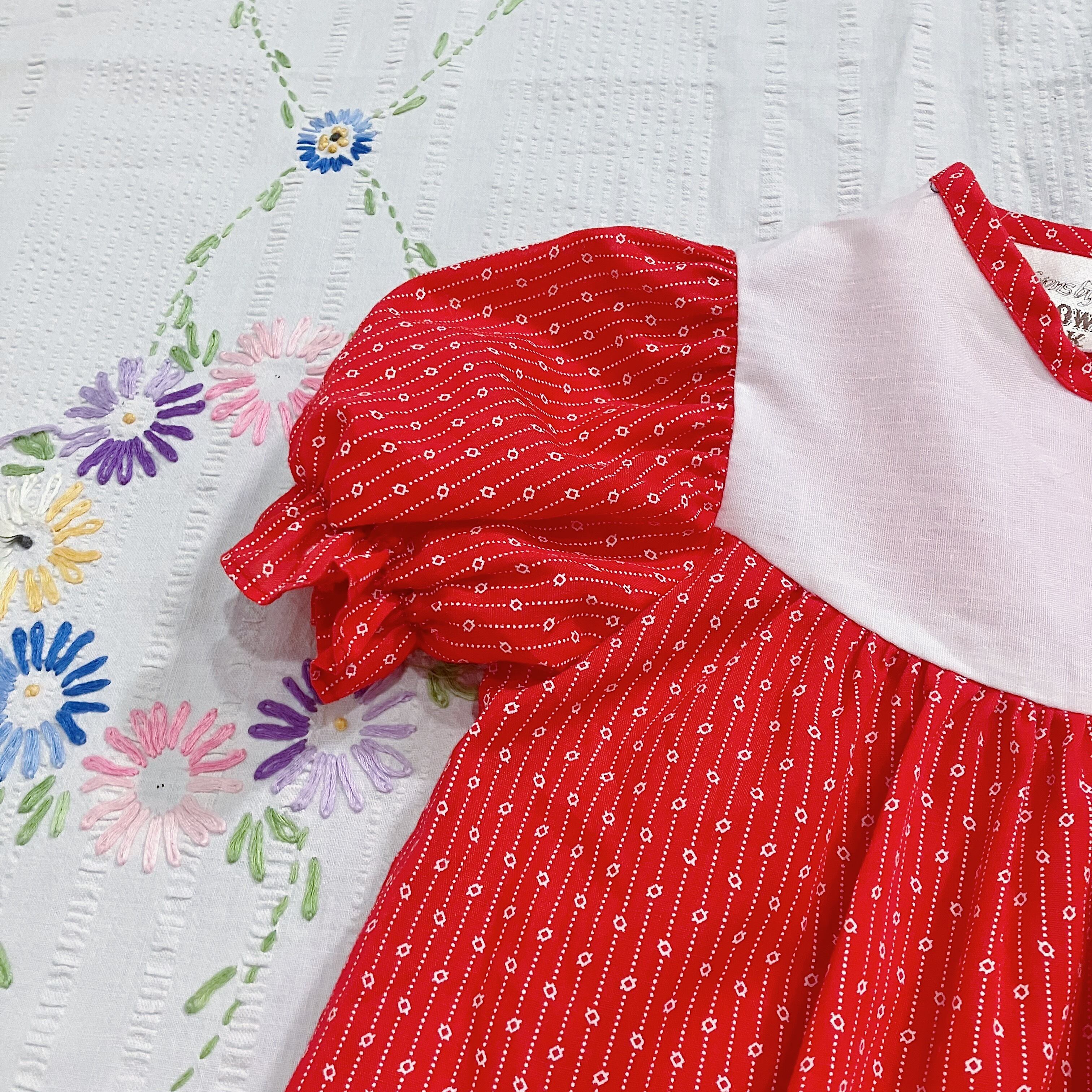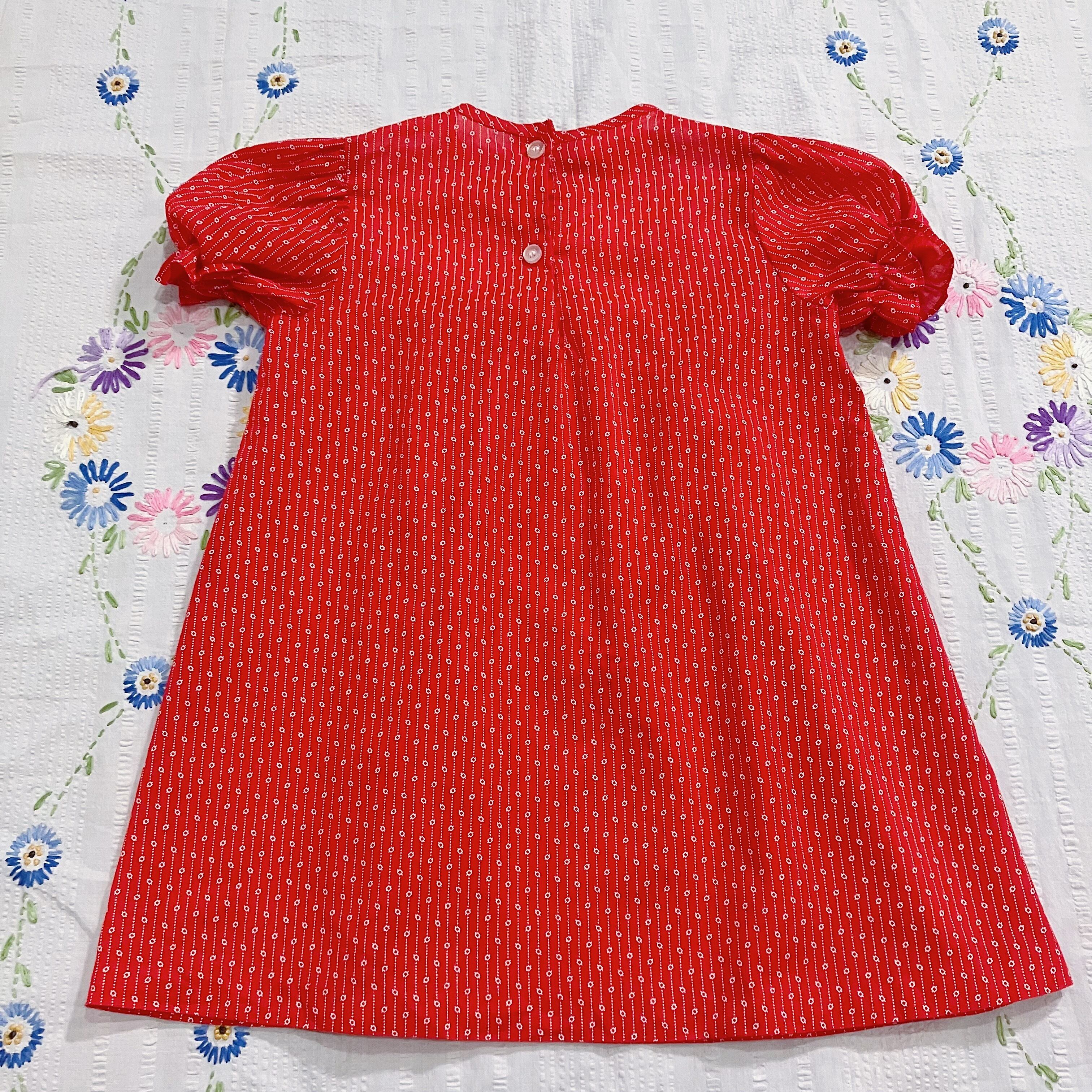 お花のパッチワークと刺繍がかわいい赤いトップス。