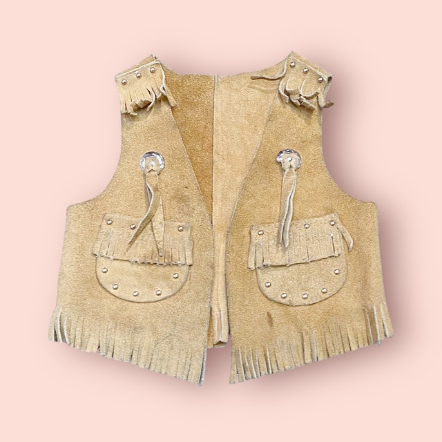 【size】 表記あり 6〜6X 日本サイズ 100〜110 【fabric】 表記あり 100%leather 【condition】 左肩のフリンジの一部が少し固くなっている箇所や、やれている箇所、ところどころ小さなシミが見受けられますがあまり気にならないかと思います。 【age】70s 【memo】 70年代のレザーベストです。 コンチョや、フリンジがたっぷりあって素敵ですよね。 ポケットも二つ付いているのでなにかと便利です。 シンプルなコーデに、このベストを一枚加えてもかわいいですよね。 カラーも万能カラーで使いやすそうです。 【exact size】 着丈 36cm(フリンジ含む) 肩幅 24cm ⚠️ネコポス/レターパックプラスでの発送の場合、日時指定を承れません。ご了承下さいませ。